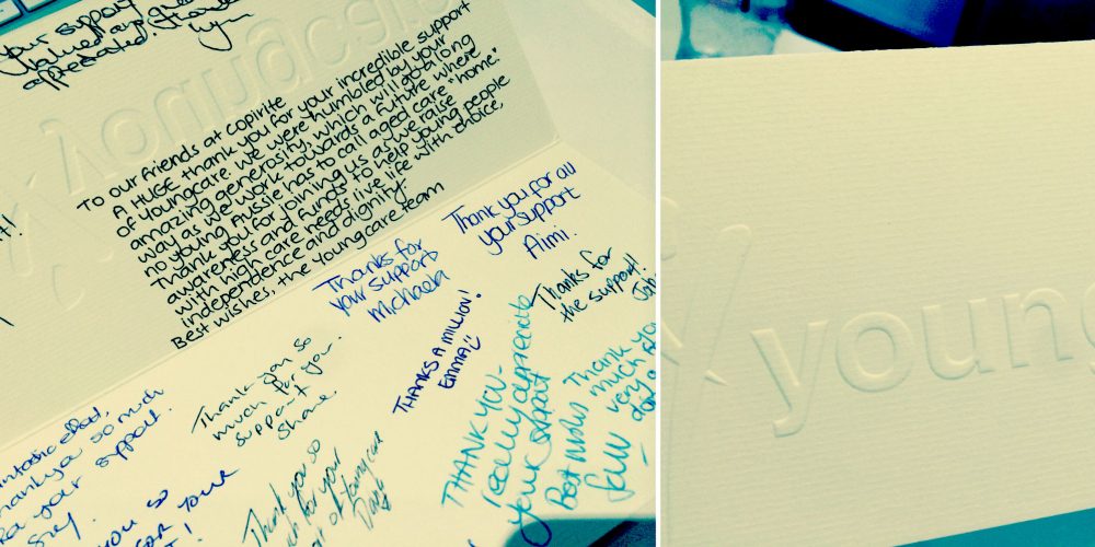 Today we received a beautiful card from one of the charities that we proudly support that has resulted in the warm fuzzies hitting. Beautifully embossed and hand signed by the Youngcare team – it certainly was the nicest thing to hit our letterbox in a while. Thank you in turn to our wonderful clients who support us and provide us with the ability to make a contribution to the causes that are close to our hearts.
